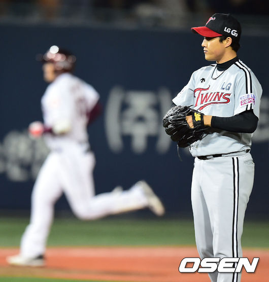 28일 오후 서울 목동구장에서 열린 한국야쿠르트 세븐 프로야구 플레이오프 2차전 넥센과 LG의 경기,7회말 LG신정락 선발투수가 넥센 유한준에게 솔로홈런을 허용한뒤 아쉬워하고 있다.