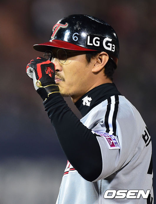 28일 오후 서울 목동구장에서 열린 한국야쿠르트 세븐 프로야구 플레이오프 2차전 넥센과 LG의 경기,8회초 1사 만루 LG 박용택이 1타점 적시타를 날린후 환호하고 있다.
