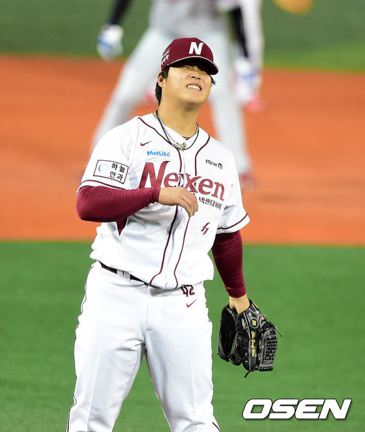 [OSEN=목동, 지형준기자] 28일 오후 서울 목동구장에서 열린 '2014 한국야쿠르트 세븐 프로야구' 넥센 히어로즈와 LG 트윈스의 플레이오프 2차전, 8회초 1사 만루에서 넥센 조상우가 밀어내기 볼넷을 허용하고 아쉬워하고 있다.