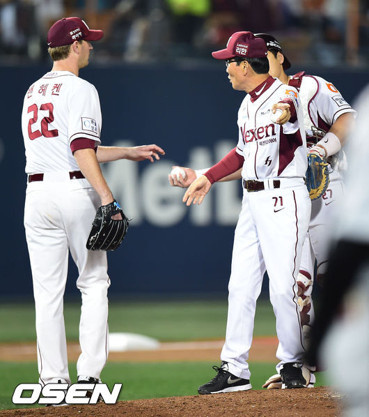 28일 오후 서울 목동구장에서 열린 한국야쿠르트 세븐 프로야구 플레이오프 2차전 넥센과 LG의 경기,8회초 넥센 선발투수 밴헤켄이 강판되고 있다