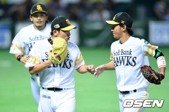 6회초 2사에서 한신 니시오카 츠요시를 삼진으로 처리한 소프트뱅크 오토나리 겐지가 더그아웃으로 가며 동료들과 하이파이브를 하고 있다.