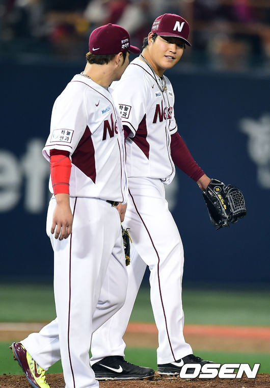 28일 오후 서울 목동구장에서 열린 한국야쿠르트 세븐 프로야구 플레이오프 2차전 넥센과 LG의 경기,8회초 1사 만루 밀어내기 볼넷과 폭투로 2실점 허용한 넥센 조상우 투수가 박병호의 독려를 받고 있다.