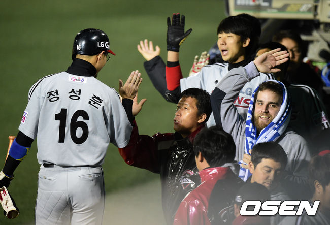 [OSEN=목동, 지형준기자] 28일 오후 서울 목동구장에서 열린 '2014 한국야쿠르트 세븐 프로야구' 넥센 히어로즈와 LG 트윈스의 플레이오프 2차전, 8회초 1사 만루에서 LG 정성훈이 밀어내기 볼넷으로 홈을 밟으며 동료선수들과 하이파이브를 하고 있다.