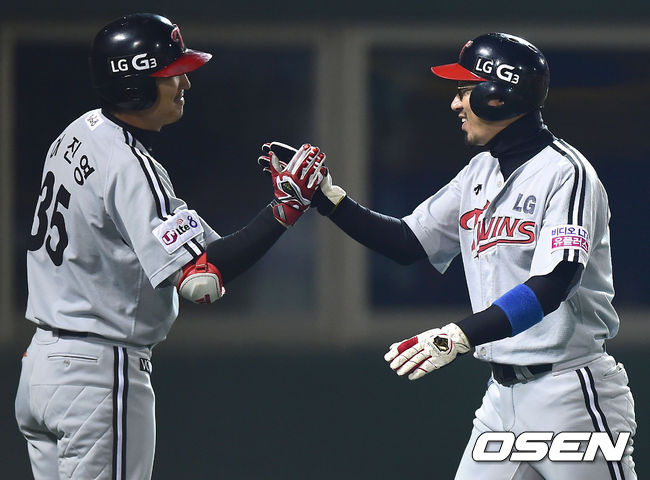 28일 오후 서울 목동구장에서 열린 한국야쿠르트 세븐 프로야구 플레이오프 2차전 넥센과 LG의 경기,8회초 1사 만루 LG 이병규 밀어내기 볼넷때 홈을 밟은 3루 주자 정성훈이 이진영과 하이파이브를 하고 있다.