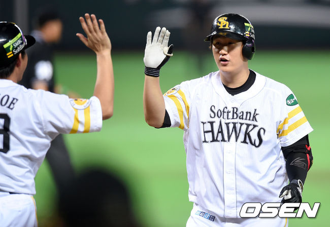 6회말 2사 만루에서 소프트뱅크 이대호가 중전 2타점 적시타를 치고 환호하고 있다.