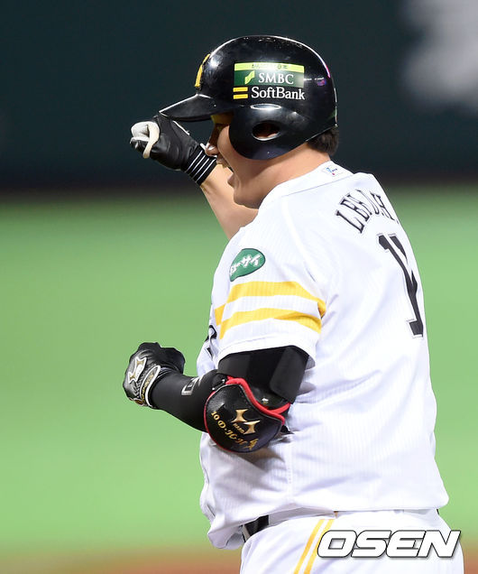 6회말 2사 만루에서 소프트뱅크 이대호가 중전 2타점 적시타를 치고 환호하고 있다.