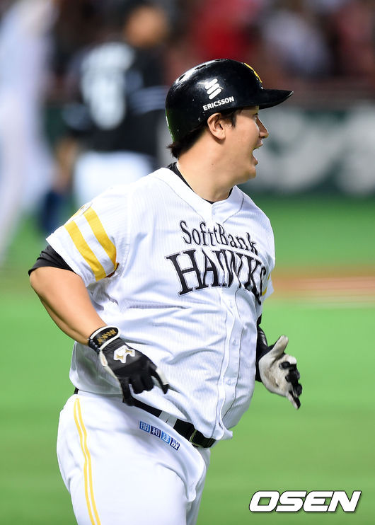 6회말 2사 만루에서 소프트뱅크 이대호가 중전 2타점 적시타를 치고 그라운드를 달리고 있다.