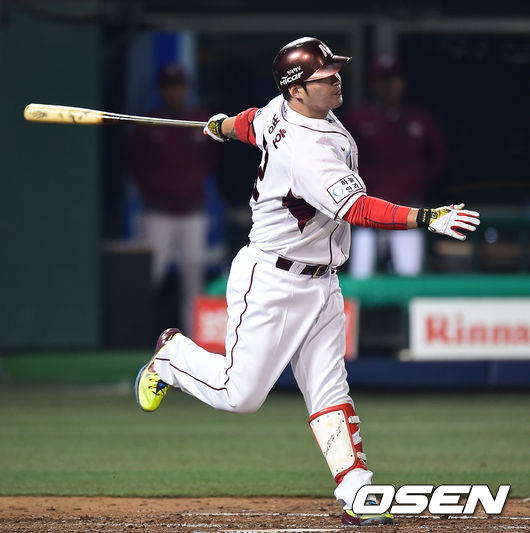 28일 오후 서울 목동구장에서 열린 2014 한국야쿠르트 세븐 프로야구 플레이오프 2차전 넥센과 LG의 경기,9회말 넥센 박병호가 헛스윙 삼진아웃당하고 잇다