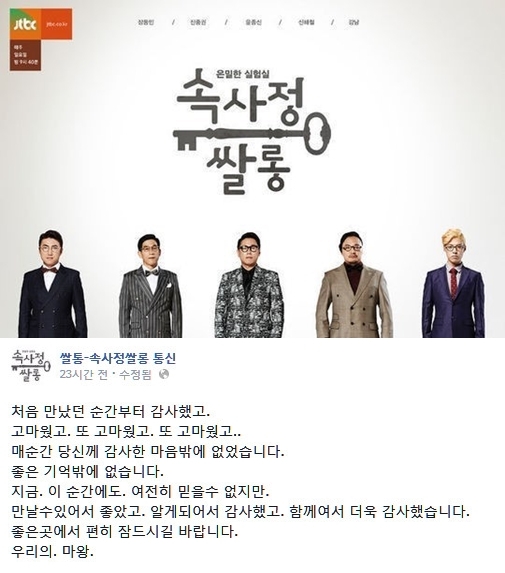 ‘속사정 쌀롱’은 27일 공식 페이스북을 통해 “처음 만났던 순간부터 감사했고 고마웠고 또 고마웠고. 매순간 당신께 감사한 마음밖에 없었습니다. 좋은 기억밖에 없습니다”라며 애도 글을 게재했다.