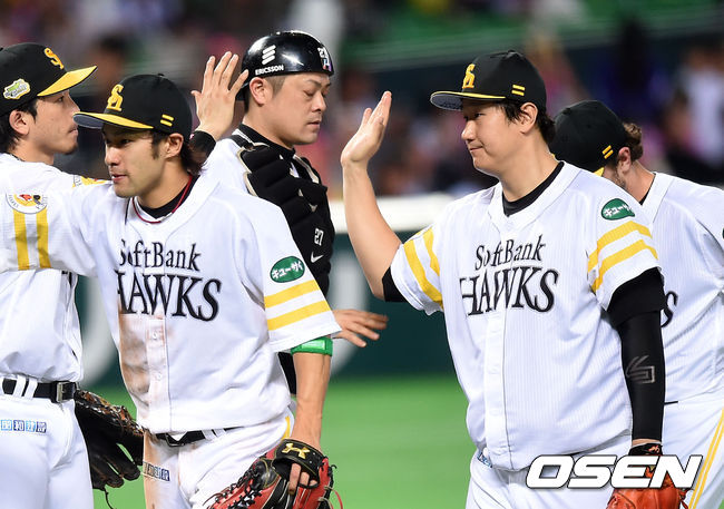 경기 종료 후 소프트뱅크 이대호가 동료들과 승리의 기쁨을 나누고 있다. /sunday@osen.co.kr