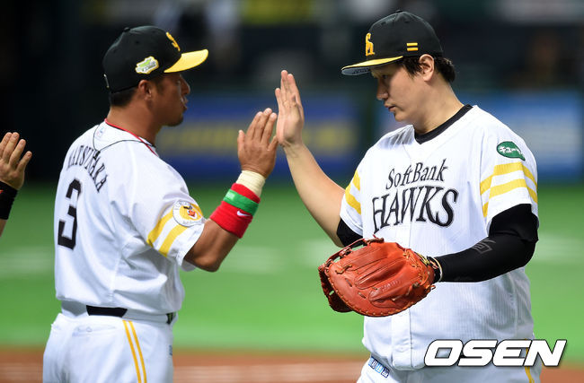 경기 종료 후 소프트뱅크 이대호가 동료들과 승리의 기쁨을 나누고 있다. /sunday@osen.co.kr