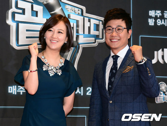 김성주는 29일 오후 서울 중구 순화동 JTBC 호암아트홀에서 열린 JTBC ‘백인백곡-끝까지 간다’(이하 끝까지 간다) 제작발표회에서 “내가 장윤정에 잘 맞춰줄 수 있을까했는데 왜 아나운서랑 결혼했는지 알 수 있더라”라며 웃었다.
