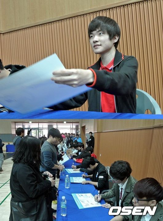 전병헌 KeSPA 협회장 개회사를 하고 있다. 아래 사진은 SK텔레콤 이상혁을 비롯한 선수들이 팬 사인회를 갖고 있는 모습.