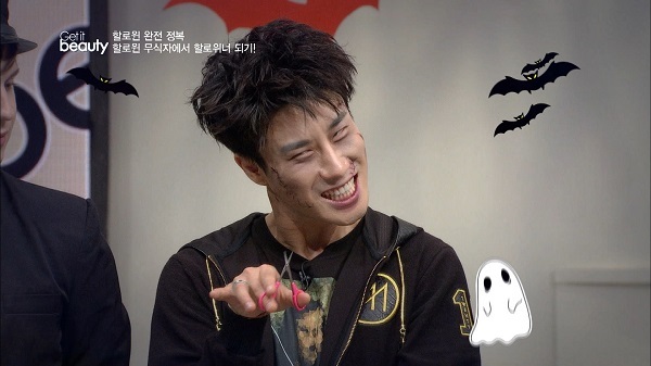 산이는 29일 방송되는 온스타일 '겟잇뷰티' 할로윈 특집에서 흉터 분장과 사방으로 삐죽 돋아난 헤어스타일로 '가위손' 변장을 선보였다.