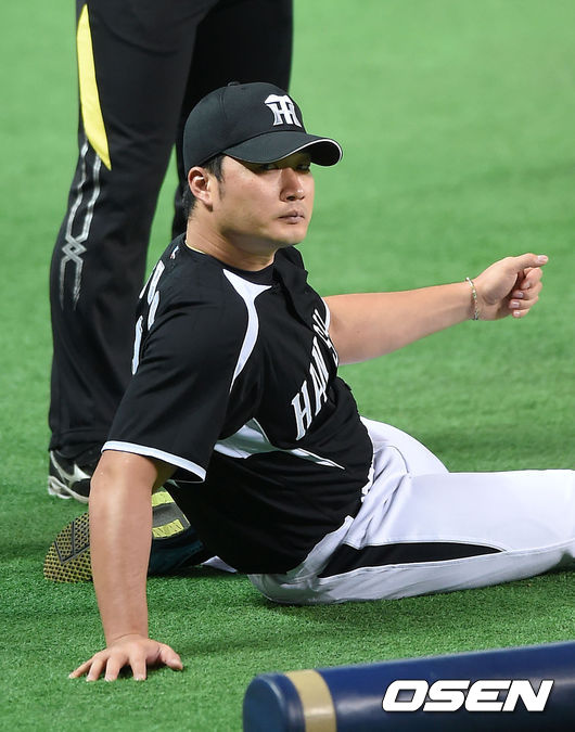 29일 오후 일본 후쿠오카현 후쿠오카 야후오크돔에서 열릴 2014 일본프로야구 일본시리즈 4차전 소프트뱅크 호크스와 한신 타이거즈의 경기에 앞서 한신 오승환이 스트레칭을 하고 있다.