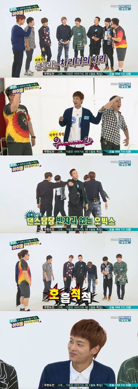 빅스는 29일 오후 방송된 MBC에브리원 예능프로그램 ‘주간아이돌’에서 즉흥적으로 나오는 자신들의 음악에 맞춰 춤을 췄다.