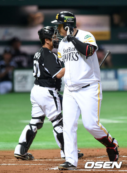 1회말 무사 만루에서 소프트뱅크 이대호가 삼진으로 물러나고 있다.