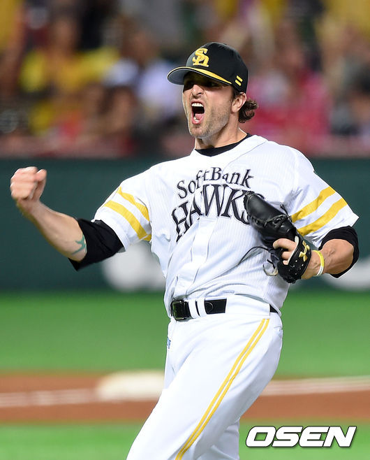 10회초 1사 1,3루에서 소프트뱅크 데니스 사파테가 한신 고메스의 병살타때 환호하고 있다.
