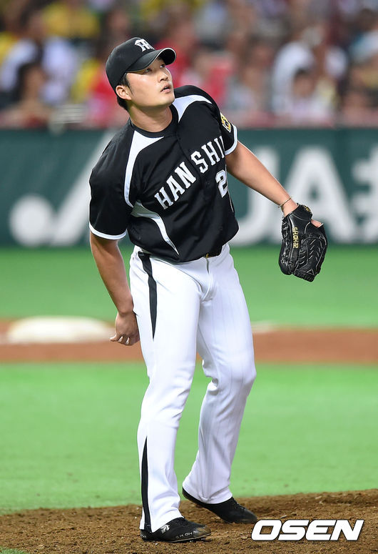 10회말 2사 1,2루에서 한신 오승환이 소프트뱅크 나카무라 아키라에게 우월 홈런을 허용하며 아쉬워하고 있다. /sunday@osen.co.kr