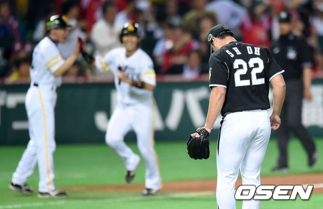 10회말 2사 1,2루에서 한신 오승환이 소프트뱅크 나카무라 아키라에게 우월 홈런을 허용하며 아쉬워하고 있다. /sunday@osen.co.kr