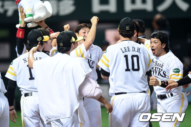 경기 종료 후 소프트뱅크 이대호가 동료들과 승리의 기쁨을 나누고 있다. /sunday@osen.co.kr