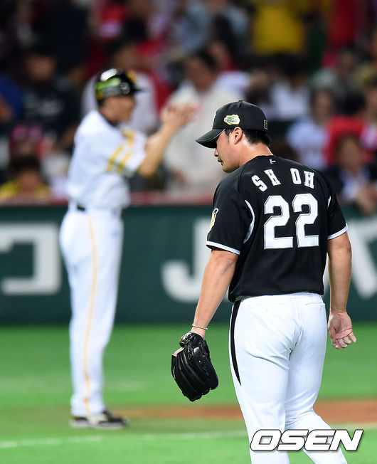 10회말 2사 1,2루에서 소프트뱅크 나카무라 아키라에게 우월 스리런 홈런을 허용한 한신 오승환이 아쉬운 표정을 짓고 있다. /sunday@osen.co.kr