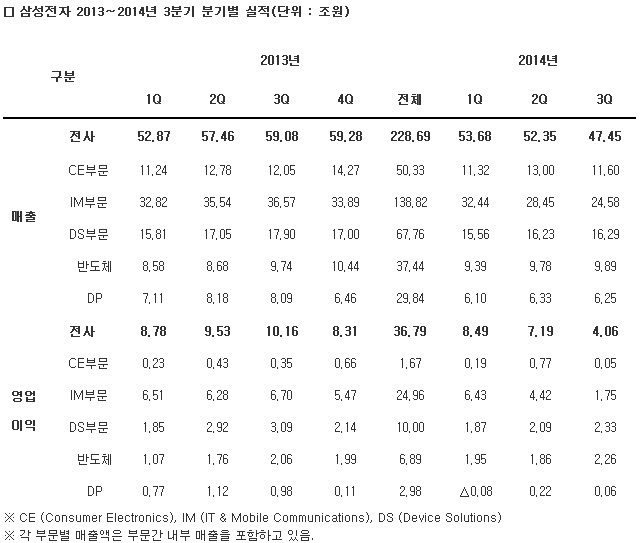 삼성전자가 2014년 3분기 연결기준으로 매출 47.45조원, 영업이익 4.06조원의 실적을 발표했다. 전분기 대비 매출은 9%, 영업이익은 3.13조원 감소한 수준이다.