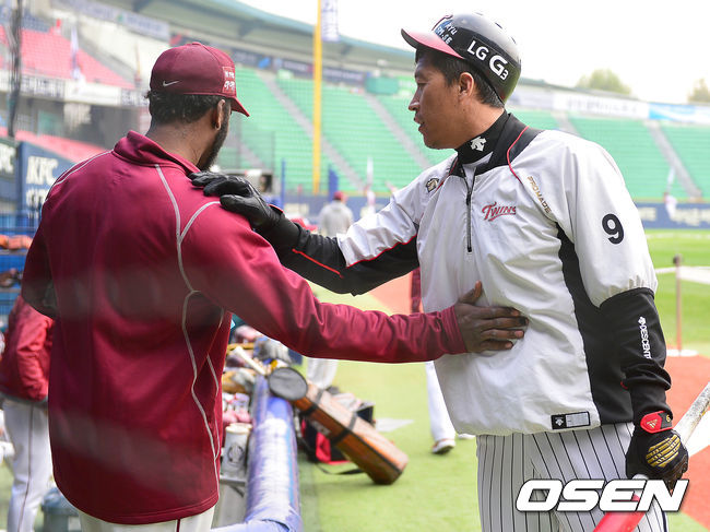 30일 오후 서울 잠실구장에서 열리는 '2014 한국야쿠르트 세븐 프로야구' 포스트시즌 플레이오프 3차전 LG 트윈스와 넥센 히어로즈의 경기를 앞두고, 넥센 소사와 LG 이병규가 인사를 나누고 있다.