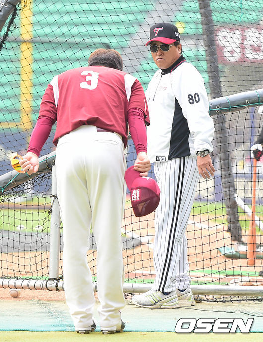30일 오후 서울 잠실구장에서 열리는 '2014 한국야쿠르트 세븐 프로야구' 포스트시즌 플레이오프 3차전 LG 트윈스와 넥센 히어로즈의 경기를 앞두고, 넥센 김민성이 LG 김무관 코치에게 인사하고 있다.