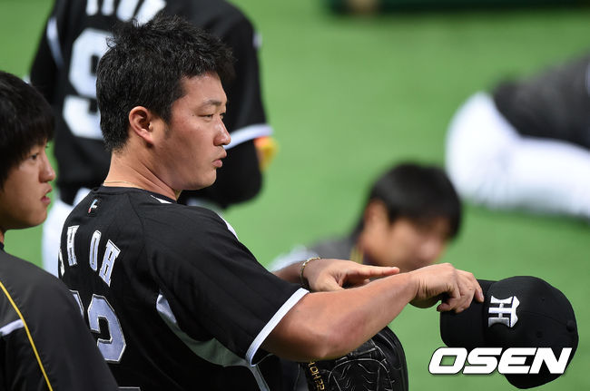 30일 오후 일본 후쿠오카현 후쿠오카 야후오크돔에서 열릴 2014 일본프로야구 일본시리즈 5차전 소프트뱅크 호크스와 한신 타이거즈의 경기에 앞서 한신 오승환이 타격 훈련 중인 이대호의 안부를 묻고 있다.