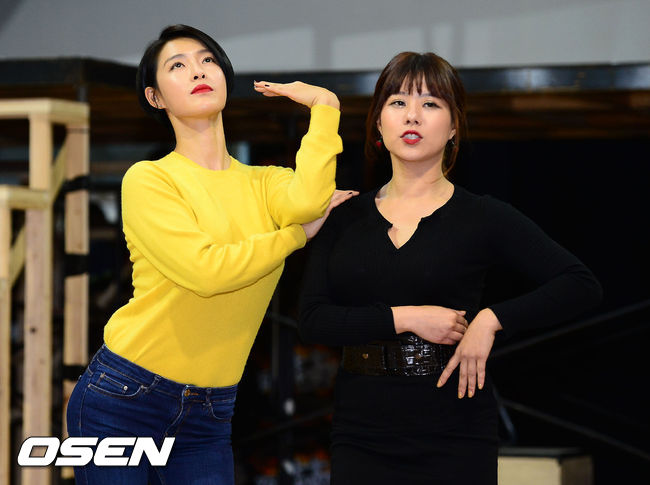 30일 오후 서울 종로구 아리온연습실에서 진행된 뮤지컬 '올슉업' 연습실 공개에서 가희와 구옥분이 포토타임을 하고 있다.