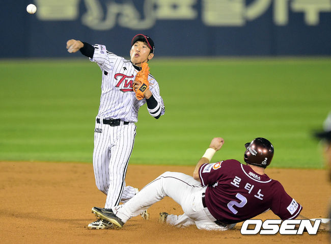 30일 오후 서울 잠실구장에서 열린 2014 한국야쿠르트 세븐 프로야구 포스트시즌 플레이오프 3차전 LG 트윈스와 넥센 히어로즈의 경기 1회초 1사 1루 유한준의 병살타를 황목치승이 2루에서 로티노를 포스아웃 시키고 1루로 송구하고 있다.