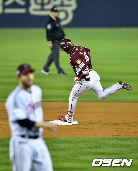 30일 오후 서울 잠실구장에서 열리는 '2014 한국야쿠르트 세븐 프로야구' 포스트시즌 플레이오프 3차전 LG 트윈스와 넥센 히어로즈의 경기, 2회초 1사 넥센 강정호가 리오단을 상대로 선취 솔로 홈런을 날린 후 그라운드를 돌고 있다.