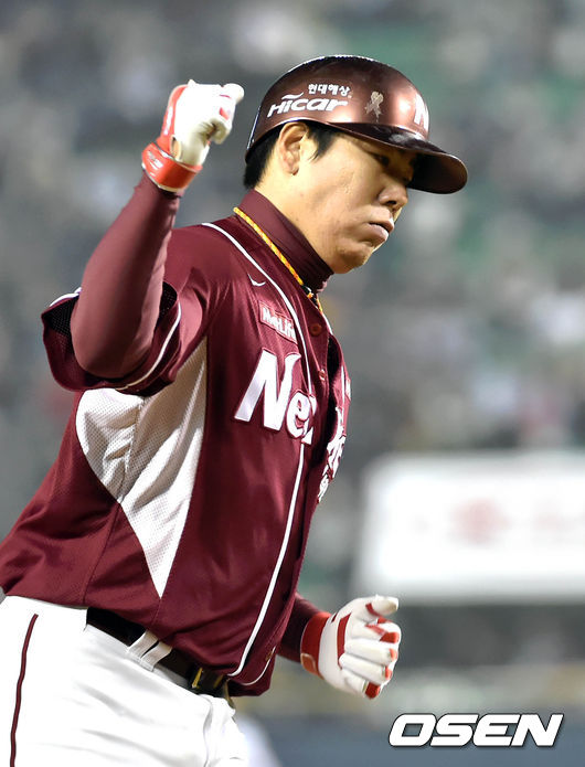 30일 오후 서울 잠실구장에서 열리는 '2014 한국야쿠르트 세븐 프로야구' 포스트시즌 플레이오프 3차전 LG 트윈스와 넥센 히어로즈의 경기, 2회초 1사 강정호가 중월 솔로홈런을 치고 좋아하고 있다.