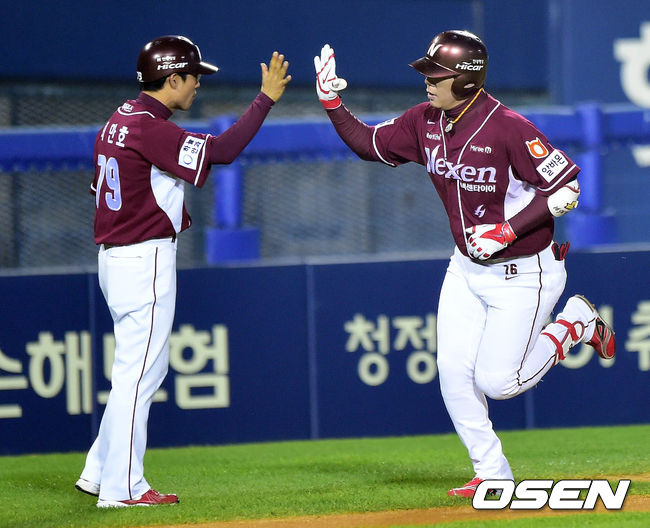 30일 오후 서울 잠실구장에서 열린 2014 한국야쿠르트 세븐 프로야구 포스트시즌 플레이오프 3차전 LG 트윈스와 넥센 히어로즈의 경기 2회초 1사 강정호가 솔로포를 치고 최만호 코치와 하이파이브를 하고 있다.