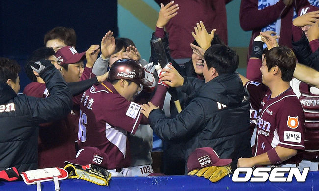 30일 오후 서울 잠실구장에서 열린 2014 한국야쿠르트 세븐 프로야구 포스트시즌 플레이오프 3차전 LG 트윈스와 넥센 히어로즈의 경기 2회초 1사 강정호가 솔로포를 치고 덕아웃에서 동료들과 기쁨을 나누고 있다.