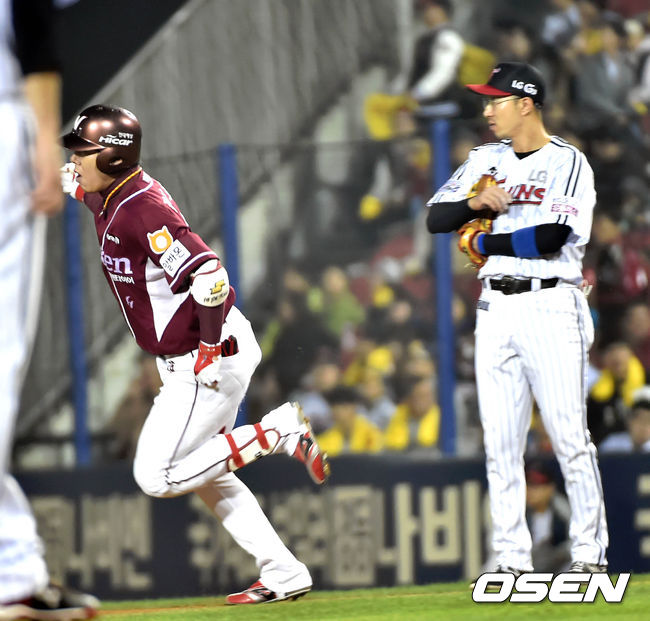 30일 오후 서울 잠실구장에서 열리는 '2014 한국야쿠르트 세븐 프로야구' 포스트시즌 플레이오프 3차전 LG 트윈스와 넥센 히어로즈의 경기, 2회초 1사 강정호가 중월 솔로홈런을 치고 좋아하고 있다.