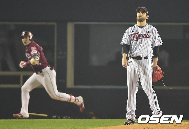 2회초 넥센 공격 1사 주자없는 상황 강정호에게 선제 중월 솔로포를 허용한 LG 선발 리오단이 아쉬워하고 있다.