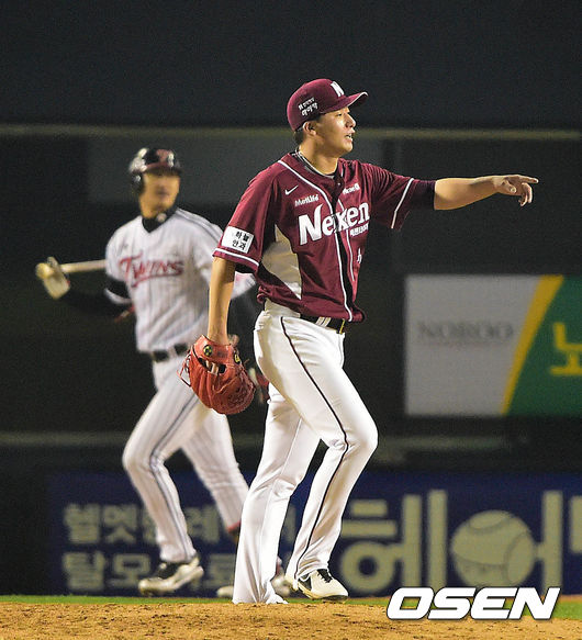 4회말 LG 공격 선두타자로 나선 박용택을 넥센 선발 오재영이 내야 플라이로 이끌며 손짓을 하고 있다.