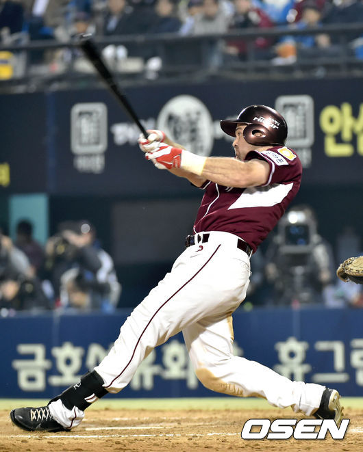 30일 오후 서울 잠실구장에서 열리는 '2014 한국야쿠르트 세븐 프로야구' 포스트시즌 플레이오프 3차전 LG 트윈스와 넥센 히어로즈의 경기, 5회초 1사 3루 로티노가 적시 2루타를 치고 있다.
