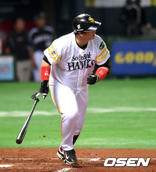 4회초 1사에서 소프트뱅크 이대호가 중전 안타를 치고 있다.