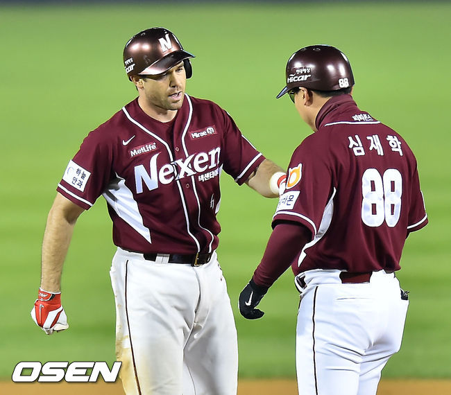 30일 오후 서울 잠실구장에서 열리는 '2014 한국야쿠르트 세븐 프로야구' 포스트시즌 플레이오프 3차전 LG 트윈스와 넥센 히어로즈의 경기, 5회초 1사 주자 3루 넥센 로티노가 우중간 1타점 적시타를 날린 후 2루에서 심재학 코치와 하이파이브를 하고 있다.