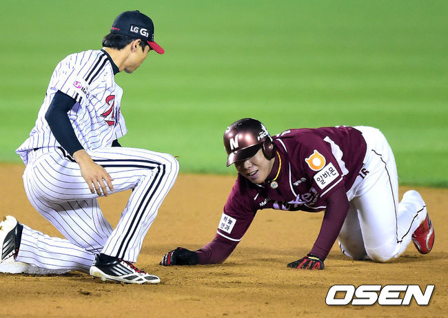 30일 오후 서울 잠실구장에서 열린 2014 한국야쿠르트 세븐 프로야구 포스트시즌 플레이오프 3차전 LG 트윈스와 넥센 히어로즈의 경기 6회초 무사 1루 김민성이 삼진을 당한 가운데, 도루를 시도하던 1루주자 강정호가 2루에서 아웃 당하고 있다.