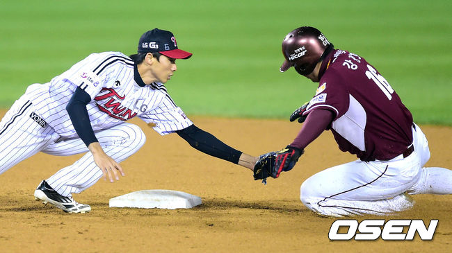 30일 오후 서울 잠실구장에서 열린 2014 한국야쿠르트 세븐 프로야구 포스트시즌 플레이오프 3차전 LG 트윈스와 넥센 히어로즈의 경기 6회초 무사 1루 김민성이 삼진을 당한 가운데, 도루를 시도하던 1루주자 강정호가 2루에서 아웃 당하고 있다.