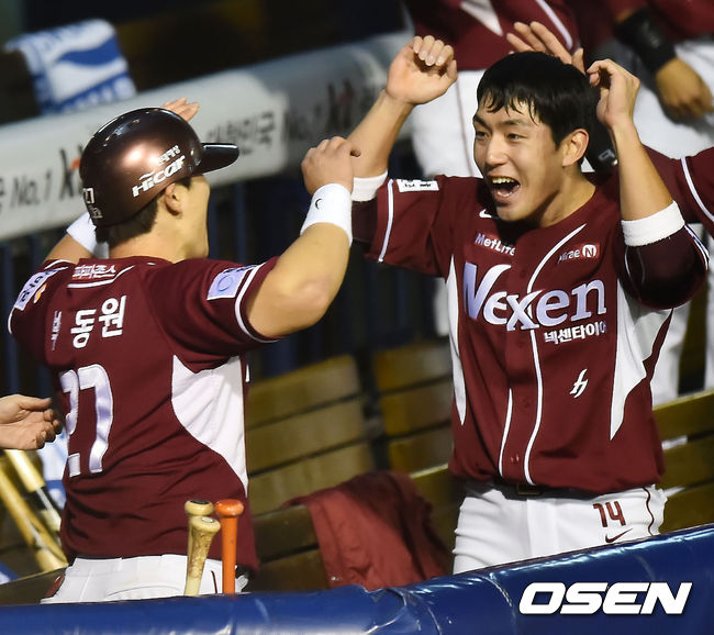 30일 오후 서울 잠실구장에서 열리는 '2014 한국야쿠르트 세븐 프로야구' 포스트시즌 플레이오프 3차전 LG 트윈스와 넥센 히어로즈의 경기, 5회초 1사 주자 3루 넥센 로티노의 우중간 1타점 적시타때 홈을 밟은 박동원이 덕아웃에서 서건창과 기쁨을 나누고 있다.