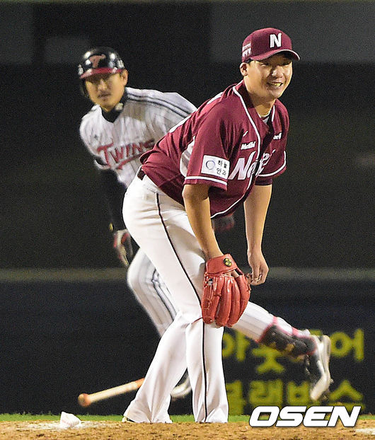 6회말 LG 공격 선두타자로 나선 박용택의 타구가 유격수 직선타로 처리되는 가운데 넥센 선발 오재영이 미소짓고 있다.