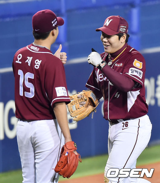 30일 오후 서울 잠실구장에서 열리는 '2014 한국야쿠르트 세븐 프로야구' 포스트시즌 플레이오프 3차전 LG 트윈스와 넥센 히어로즈의 경기, 6회를 마친 넥센 선발 오재영과 강정호가 하이파이브를 하며 환하게 웃고 있다.