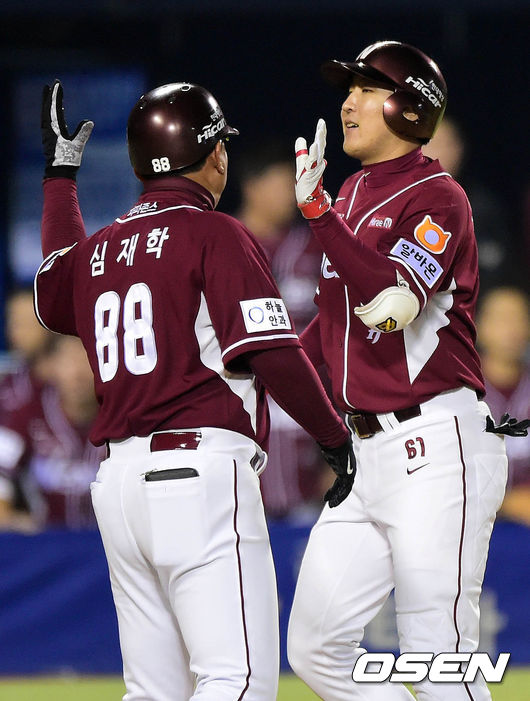 30일 오후 서울 잠실구장에서 열린 2014 한국야쿠르트 세븐 프로야구 포스트시즌 플레이오프 3차전 LG 트윈스와 넥센 히어로즈의 경기 8회초 1사 유한준이 솔로홈런을 치고 심재학 코치와 하이파이브를 하고 있다.