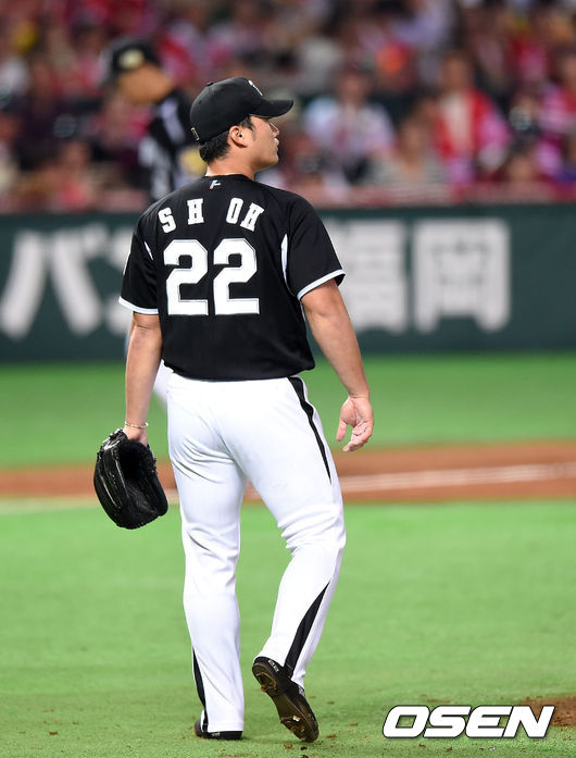 8회말 2사 1,3루에서 한신 오승환이 소프트뱅크 나카무라 아키라를 외야플라이로 처리하고 더그아웃으로 가고 있다.