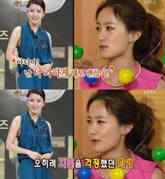 김지민은 30일 방송된 KBS 2TV 예능프로그램 ‘해피투게더3’에서 “김희애 씨와 함께 화장품 프로모션을 했다”고 말했다.